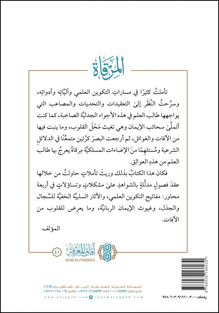 إن هذا الكتاب وريث تأملات حاولتُ من خلالها عقد فصولٍ مدللة بالشواهد على مشكلاتٍ وتساؤلاتٍ في أربعة محاور: مفاتيح التكوين العلمي، والآثار السلبية الخفية للسجال والجدل، وغيوث الإيمان الربانية، وما يعرض للقلوب من الآفات؛ هذه التساؤلات مما مرَّ بي شخصياً أو