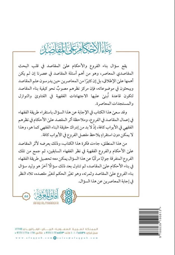 يقع سؤال بناء الفروع والأحكام على المقاصد في قلب البحث المقاصدي المعاصر، وهو من أهم أسئلة المقاصد في عصرنا إن لم يكن أهمها على الإطلاق، بل إن كثيرًا من المعاصرين حين يدرسون علم المقاصد ويبحثون في موضوعاته، فإن مركز نظرهم مصوبٌ نحو كيفية بناء المقاصد لتكون قاعدة تُبنى عليها الاجتهادات الفقهية في الفتاوى والنوازل والمستجدات المعاصرة. وقد سعى هذا الكتاب في الإجابة عن هذا السؤال باستقراء طريقة الفقهاء في إعمال المقاصد في الفروع، وملاحظة أثر المقصد على الأحكام في نظرهم الفقهي في الأبواب كافة، إذْ لا بد من إدراك حقيقة البناء الفقهي كما هو، وهذا لا يمكن دون استقراءٍ يلاحظ مفصل الفروع في الأبواب كافة. من هذا المنطلق، جاءت فكرة هذا الكتاب، وذلك بعرضه لأثر المقاصد على الأحكام والفروع الفقهية في نظر الفقهاء السابقين، ثم جمع من تلك الفروع المتفرقة جوابًا مركّبًا عن هذا السؤال يمكن معه تحصيل طريقة الفقهاء في بناء الأحكام على المقاصد، ثم تناول بعد ذلك سؤالًا آخرَ هو وليد سؤال بناء الفروع على المقاصد وثمرته، وهو تغيّر الحكم لتغيّر مقصده، تلاه النظر في إجابة المعاصرين عن هذا السؤال.
